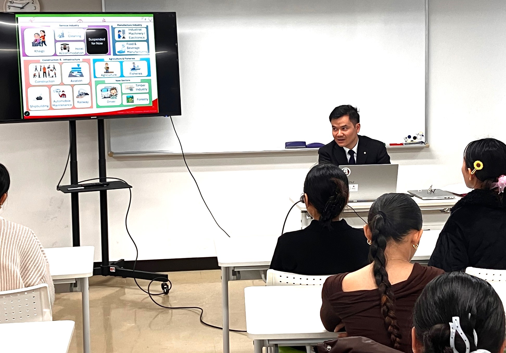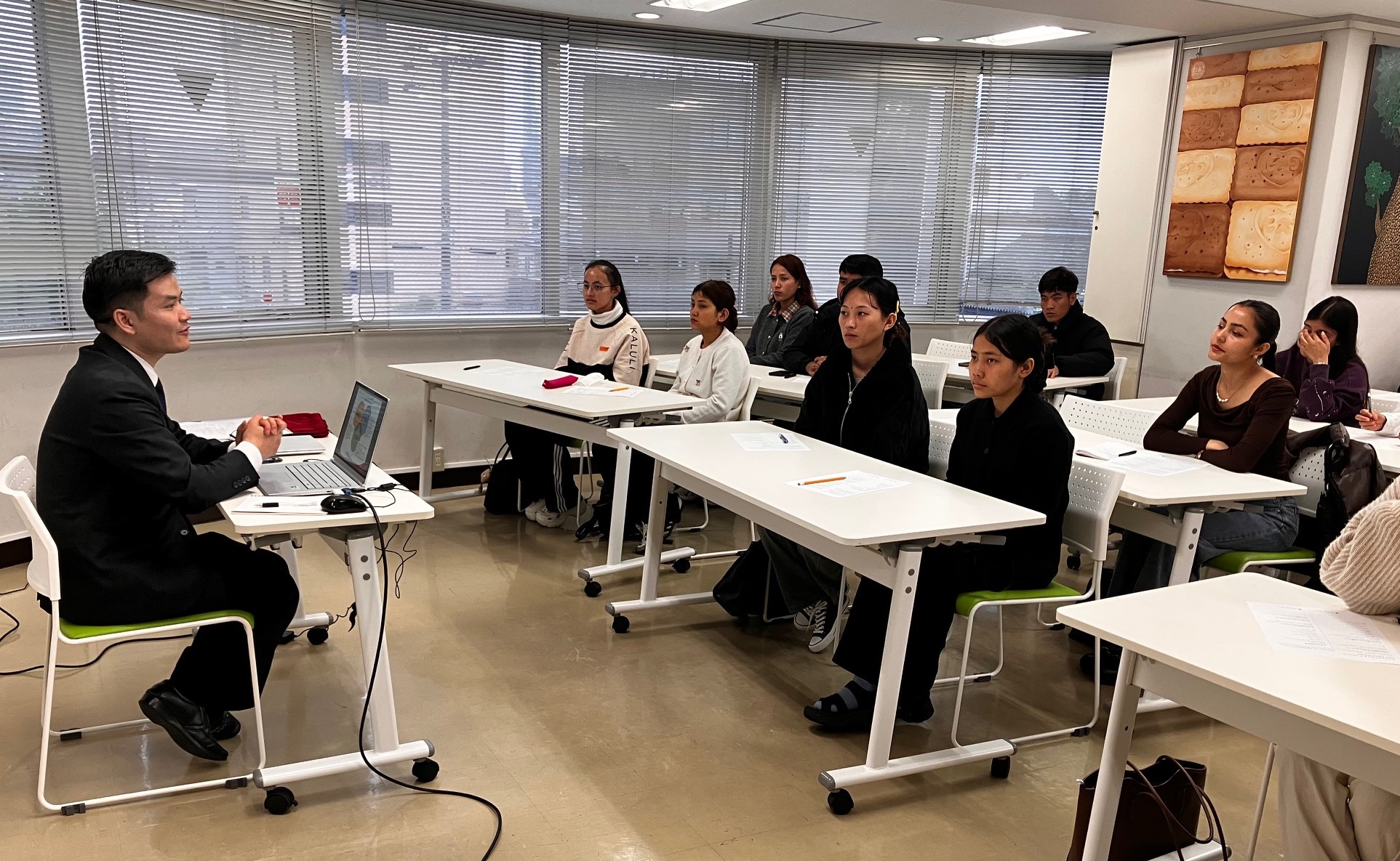 内容は、日本での就職の流れや専門学校でのスケジュール、在留資格(技人国・特定技能)の基本的な違い、日本語力や成績の大切さなど、これからの学生生活に直結するものばかり。また、先輩留学生の事例を通して、うまくいったケースや気をつけるポイントについても紹介がありました。