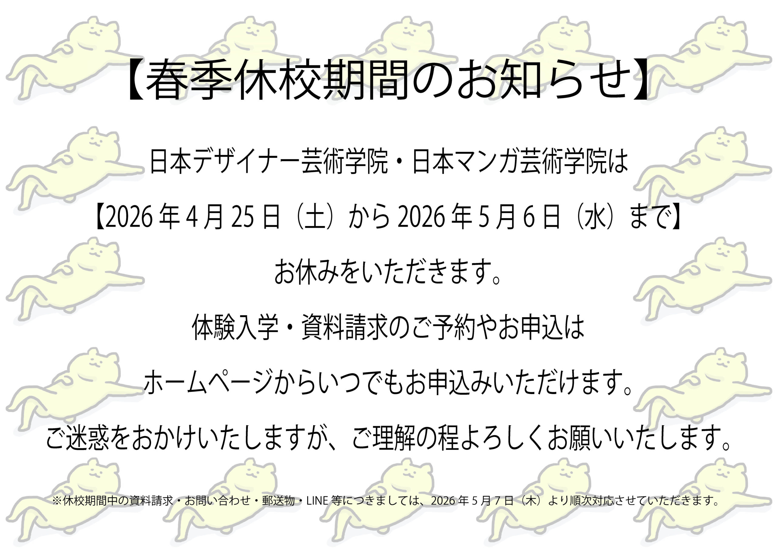 2026-04-20 #お知らせ 春季休校期間のお知らせ 日本デザイナー芸術学院・日本マンガ芸術学院は【2026年4月25日(土)から2026年5月6日(水)】までお休みをいただきます。 この期間のお問い合わせや資料請求には通常よりお時間をいただきます。 ご迷惑をおかけいたしますが、ご理解の程よろしくお願いいたします。 前の記事 次の記事